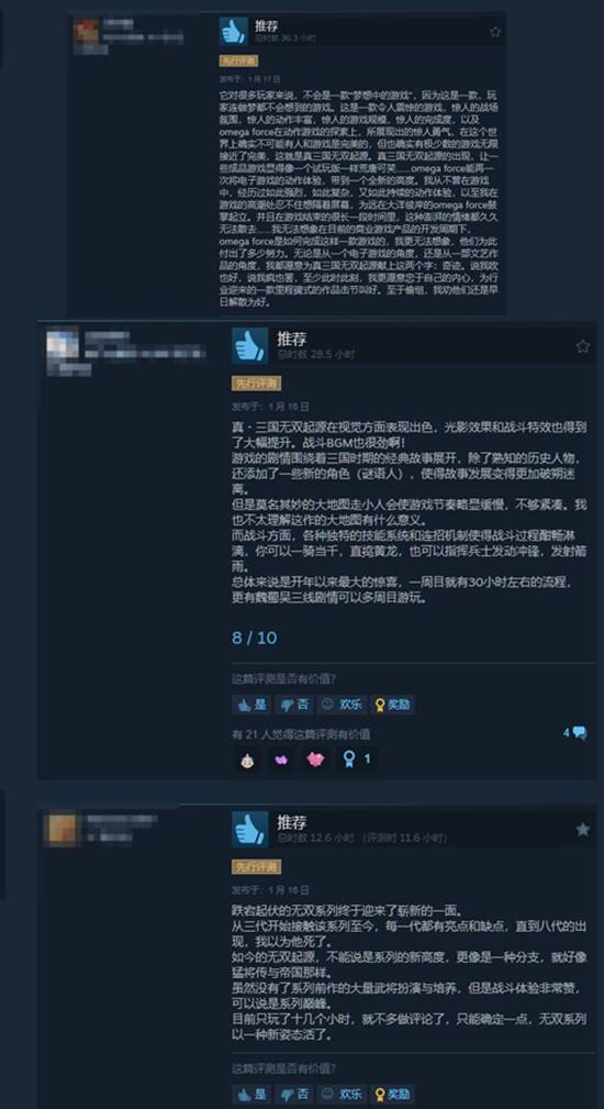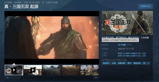 截止至发稿时,本作在Steam平台的评分为“好评如潮”!共收获1471条评价,好评率高达95%!已经通过“抢先体验”游玩了本作的玩家们纷纷赞不绝口,认为本作是一款“玩家连做梦都不会想到的游戏!”是完完全全的《真三国无双》系列重生之作!