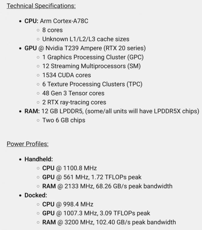 根据最新的泄露信息,Switch 2在掌机模式下GPU的时钟速度为561MHz,浮点运算性能为1.71TFLOPS。而在底座模式下,GPU时钟速度可提升至1000MHz,浮点运算性能增加到3.1TFLOPS。换句话说,底座模式下Switch 2的性能相较掌机模式几乎翻倍。