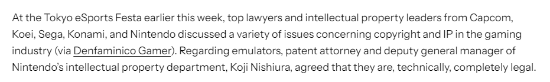 在本周早些时候举行的东京电子竞技节上,卡普空、科乐美、世嘉 和任天堂的律师和知识产权负责人讨论了游戏行业中有关版权和知识产权的各种问题。任天堂的首席知识产权律师Koji Nishiura在会议上同意模拟器“从技术上来看”是合法的。