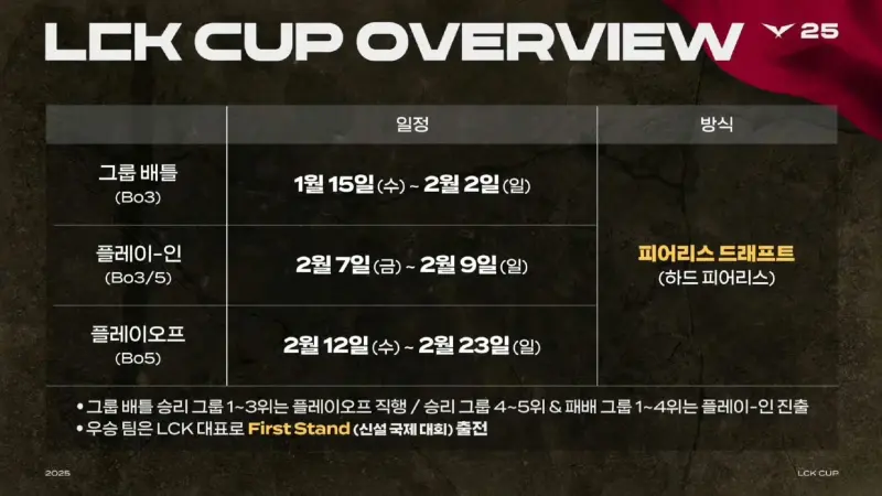 最终获得LCK杯冠军的队伍将代表LCK赛区参加First Stand赛事,而所有的比赛将采用全局BP系统。