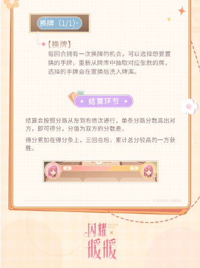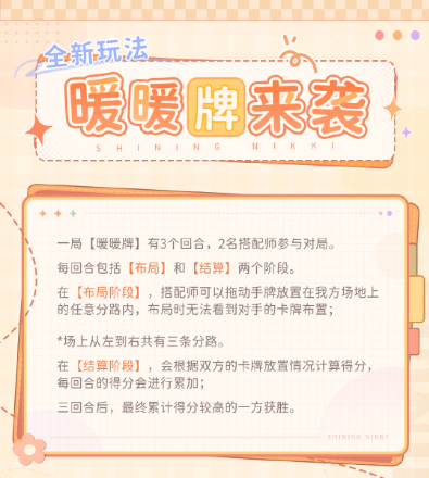 2.每局【暖暖牌】包括有3个回合,2名搭配师参与对局;每回合包括【布局】和【结算】两个阶段。