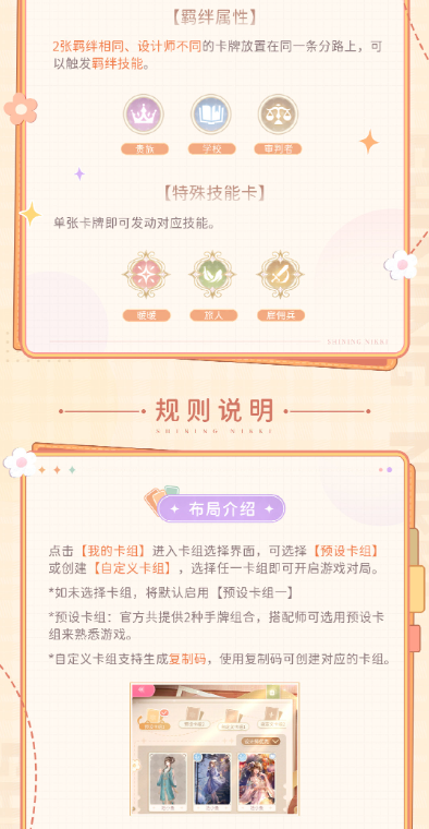 「羁绊」属性:2张设计师不同、羁绊相同的卡牌同时上场,可以发动对应的羁绊技能;