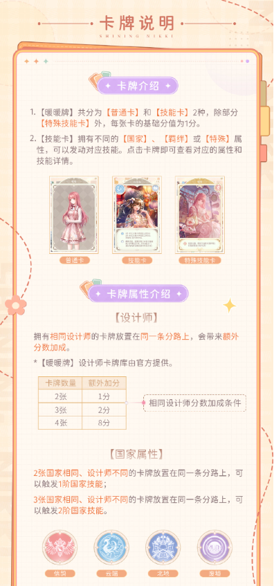 「国家」属性:2张设计师不同、国家相同的卡牌同时上场,可以发动1阶国家技能;3张设计师不同、国家相同的卡牌同时上场,可以发动2阶国家技能;