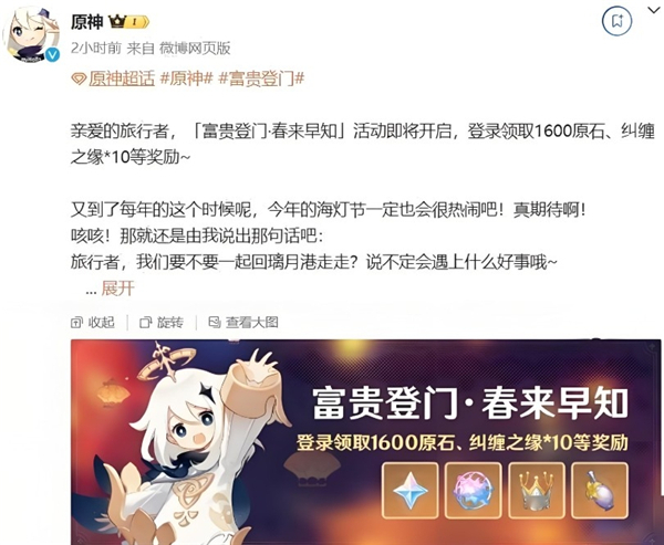 米哈游昨日1月20日宣布,旗下热门游戏原神将启动富贵登门·春来早知特别活动。活动期间,玩家可通过参与开门迎财·累计登录和旧忆新桃·海灯节答谢活动,获得1600原石、10个纠缠之缘等丰厚奖励。
