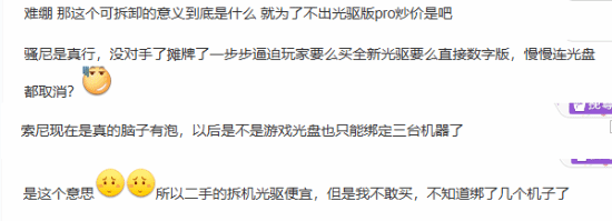 本来光驱就非常难买,这下更是引发玩家们的不满。除了对光驱和PS5 Pro的吐槽外,还有玩家担心日后索尼会不会也对实体光盘做出类似的限制,“逼迫”更多玩家转向数字版游戏。