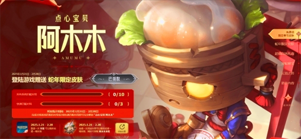 活动内容:玩家可以通过参与活动,免费领取阿木木皮肤,感受这只可爱的英雄的新春装扮。