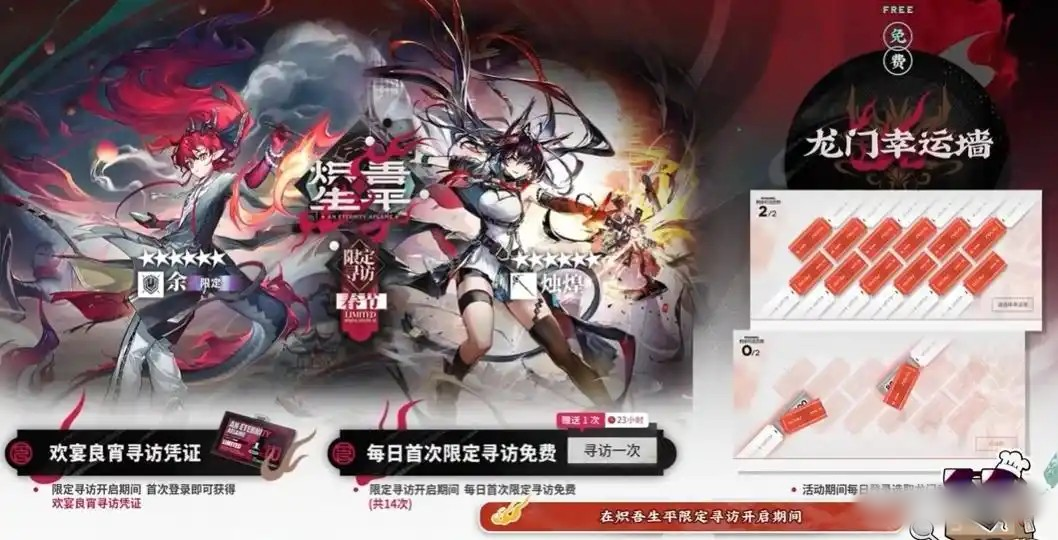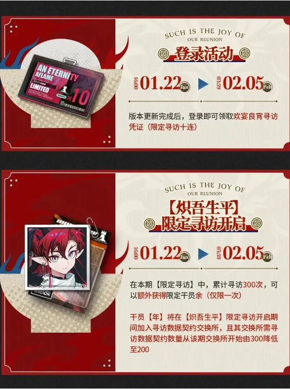 1月22日-2月5日:限定寻访每日赠送一抽,共可获取14抽。