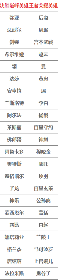 决胜巅峰和王者荣耀英雄对照表-决胜巅峰和王者荣耀相似的英雄