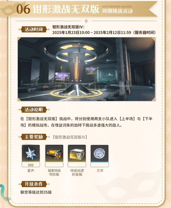 鸣潮2025春节活动一览:2025年春节即将到来,鸣潮也迎来了2.0版本下半阶段的大型活动。这次春节特别活动将带来丰富的玩法和奖励,不仅有全新任务,还有专属服饰等你来拿!以下为本次春节活动的详细内容,大家可以参考看看。