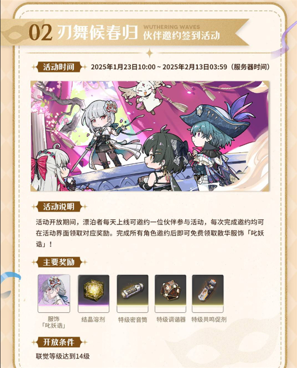 活动期间,漂泊者每天可以邀约一位伙伴参与活动,完成邀约即可领取奖励。完成所有角色邀约后,免费获得散华服饰「妖诰」!