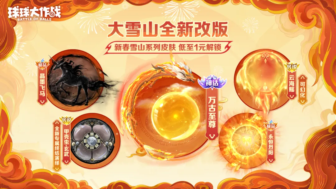 大雪山全新改版将于1月24日上线!传说关键词「晶墨飞马」、传说关键词「甲壳虫·玄武」、神话关键词「万古至尊」、极品关键词「永恒烈阳」、传说关键词「云海鳐」最低1元即可解锁,准备好启程亲临大雪山,探秘藏在其中的珍宝吧!