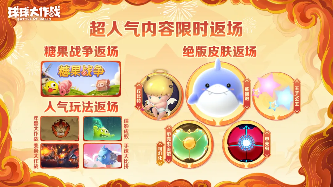 1月24日「糖果战争」、「年兽大作战」、「变身大作战」、「侠影成双」、「手速大比拼」五大人气玩法限时返场,给予全体球宝最佳节日体验,享受游戏之趣!同时「丘比特」、「鲨饱饱」、「王子/公主」、「甲壳虫·流萤」、「甲壳虫」五款绝版皮肤返场,超绝稀有皮肤锁定蛇年不错过。