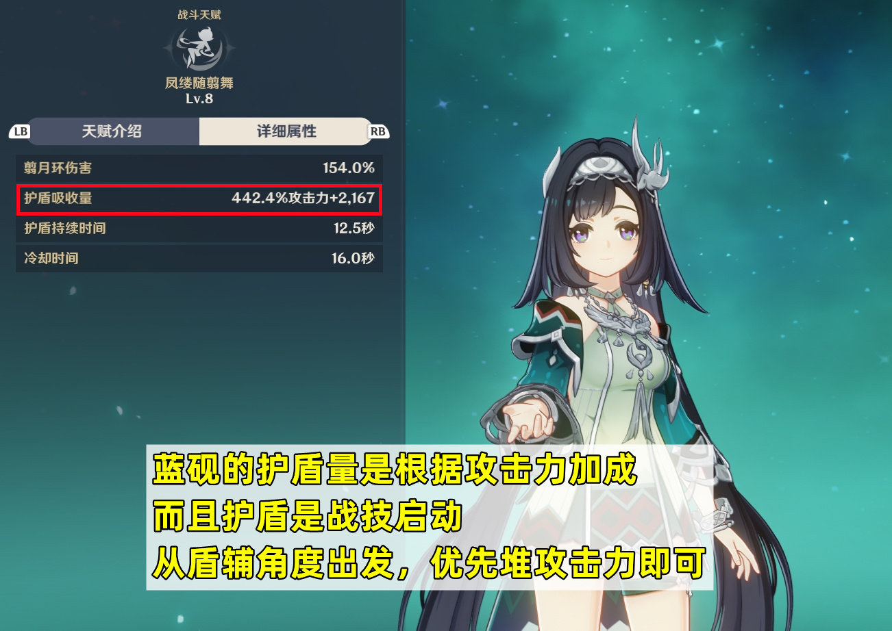 词条方面,因为蓝砚的护盾量是根据攻击力加成,并且是战技启动,因此优先堆攻击力即可。主词条推荐:攻击沙、攻击杯、攻击头;副词条推荐:攻击>充能,如果武器带的是西风秘典,还可以适当堆点暴击。