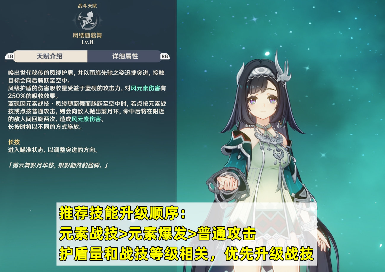 推荐技能升级顺序:元素战技>元素爆发>普通攻击。蓝砚的护盾量和元素战技等级有关;而元素爆发的作用主要是提供一定的聚怪,然后是补充伤害。