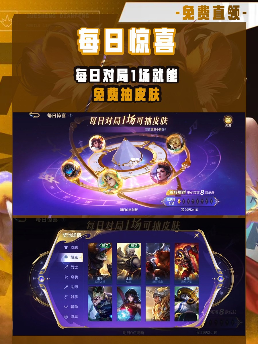 签到奖励:连续签到30天,每天都可以领取英雄或皮肤奖励。