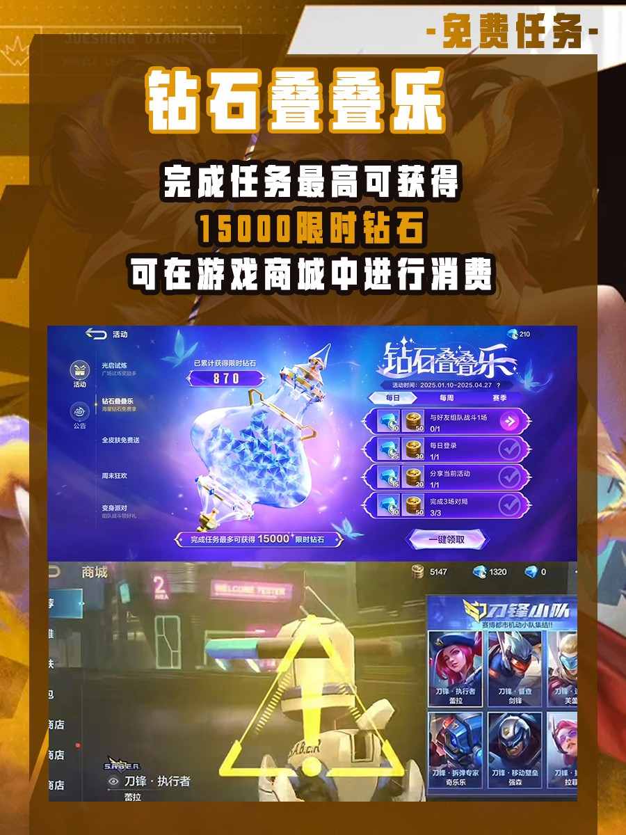 钻石奖励:每天可领取100限时钻石,总任务期间最高可获得15,000钻石!