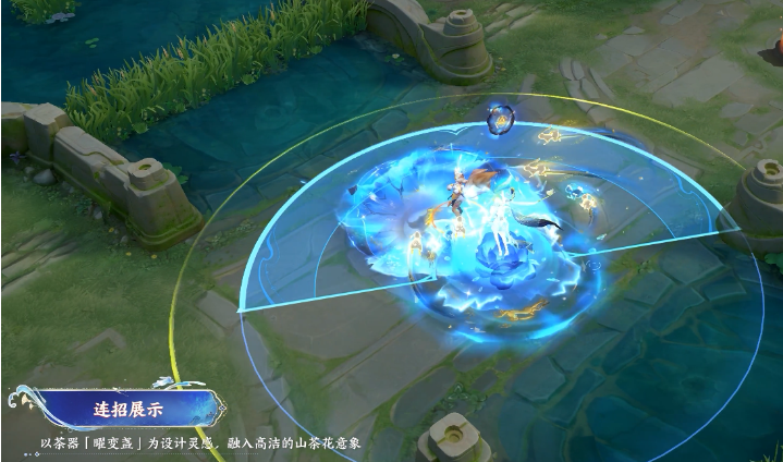 ◆二技能:器灵轻轻抬手,落星盏开始拼合。同一时刻,她脚下涌现一汪清水,水中花瓣与游鱼交织。当器灵与盏重合时,寓意水入茶盏,茶汤浮现山茶花枝。