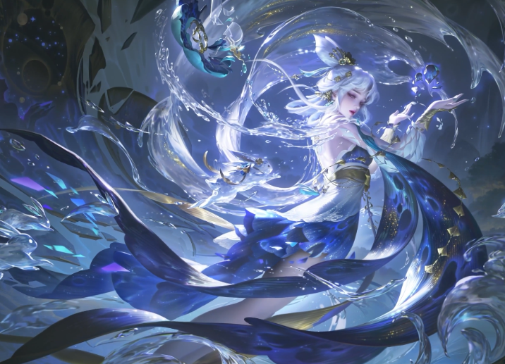 ◆归月:(回城特效设计)器灵在水中嬉戏,盏中世界逐渐显现,漫天星河恒存盏中,釉光明灭,唯有小兔相伴。