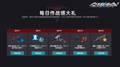 活动期间,每日作战同样精彩纷呈。老兵们只需通关PVE模式任意难度地图次数达到指定要求,次日12点即可前往官方活动页面领取丰厚的奖励,包括战神-致命潜伏(橙)、次元聚能炮Mk.4(15天)、超能-寒霜先锋(橙)、搞机箱*7以及暴君-亡魂颂歌(橙)等。其中,战神-致命潜伏是国联工程部在收集了各类蓄能武器的战斗数据之后,结合无限次元技术打造出这件超级狙击枪。枪械通过连续射击充能,可凝聚弹匣内全部子弹打出一次必为弱点的“致命一击”。这些外观炫酷的奖励将极大丰富老兵们的装备库,提升作战效能。
