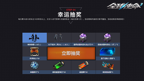 幸运抽奖环节为本次活动增添了更多惊喜。老兵们只需每日累计战斗时长达10分钟及以上,次日12点即可获得1次抽奖机会(每日仅限1次)。有永久时装炼狱挽歌(男/女)、光子战衣(男/女)、暴君武器自选礼包、超能武器自选包等,更有量子试炼入场券、神器碎片、搞机箱等多重好礼等待着老兵们的赢取,让回归之路更加丰富多彩。