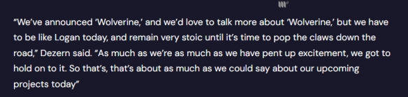 他在采访中表示:“我们已经公布了《金刚狼》,我们很愿意谈更多关于这款游戏的事,但今天我们得像洛根一样保持冷静,直到时机成熟,爪子才会展现。”他补充道:“尽管我们内心充满激动,但我们必须保持耐心。所以,今天我们只能透露这么多。”