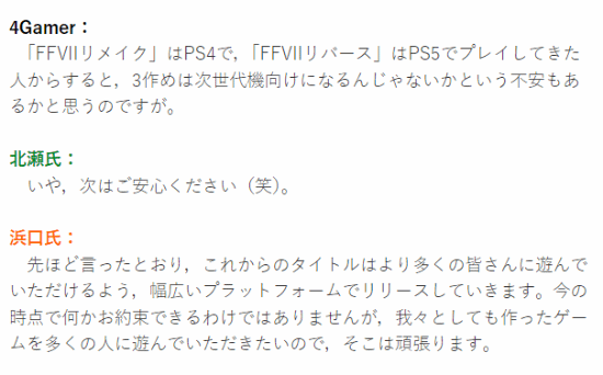 采访中,记者问道:《最终幻想7重制版》最初是PS4独占,而《最终幻想7重生》在发售时则是PS5独占,因此不少人疑惑第三部可能会成为PS6的独占游戏。对此,北濑佳范表示:“不,你可以放心,下一部作品不会是独占。”