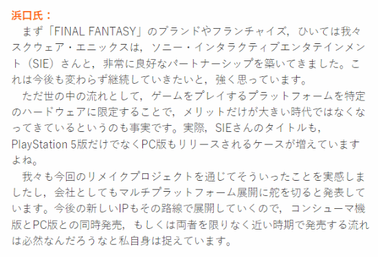 制作人表示:“SE公司、《最终幻想》IP和索尼建立了非常良好的合作伙伴关系。我强烈希望这种情况在未来能够继续下去,然而,作为世界趋势,越来越多的SIE游戏不仅在PlayStation 5上发布,也在PC上发布。我们通过这个重制项目认识到了这一点,公司也宣布将转向多平台开发。未来的新IP都会沿着同样的路线进行开发。就我个人而言,我也希望看到日本PC游戏市场发展到另一个水平。从全球角度来看,我认为日本PC游戏市场仍然有很大的潜力。”