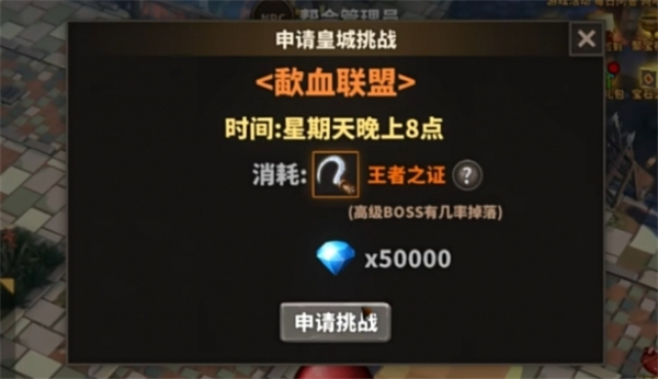 在点击“申请攻城”后,你将需要消耗一枚“王者之证”以及50000枚钻石。消耗这些资源后,皇城挑战将正式开启。