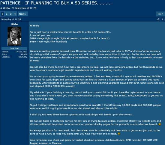 英国零售商Overclockers UK(OCUK)近日确认,即将上市的英伟达GeForce RTX 5090和5080游戏GPU的首发供货将“非常紧张”。该公司采购经理Andy Gibson(网名“Gibbo”)表示,如果玩家想购买这些新显卡,就需要保持“耐心”。