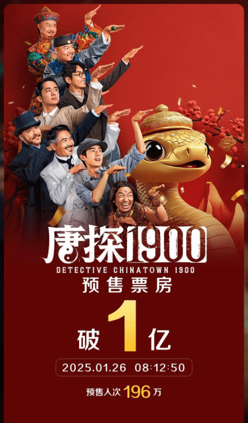 《唐人街探案》系列第四部《唐探1900》将于将于2025年1月29日,也就是大年初一这天正式上映。本片由陈思诚、戴墨执导,陈思诚编剧,王宝强、刘昊然领衔主演,周润发特邀主演。目前影片的预售票房已突破1亿大关!