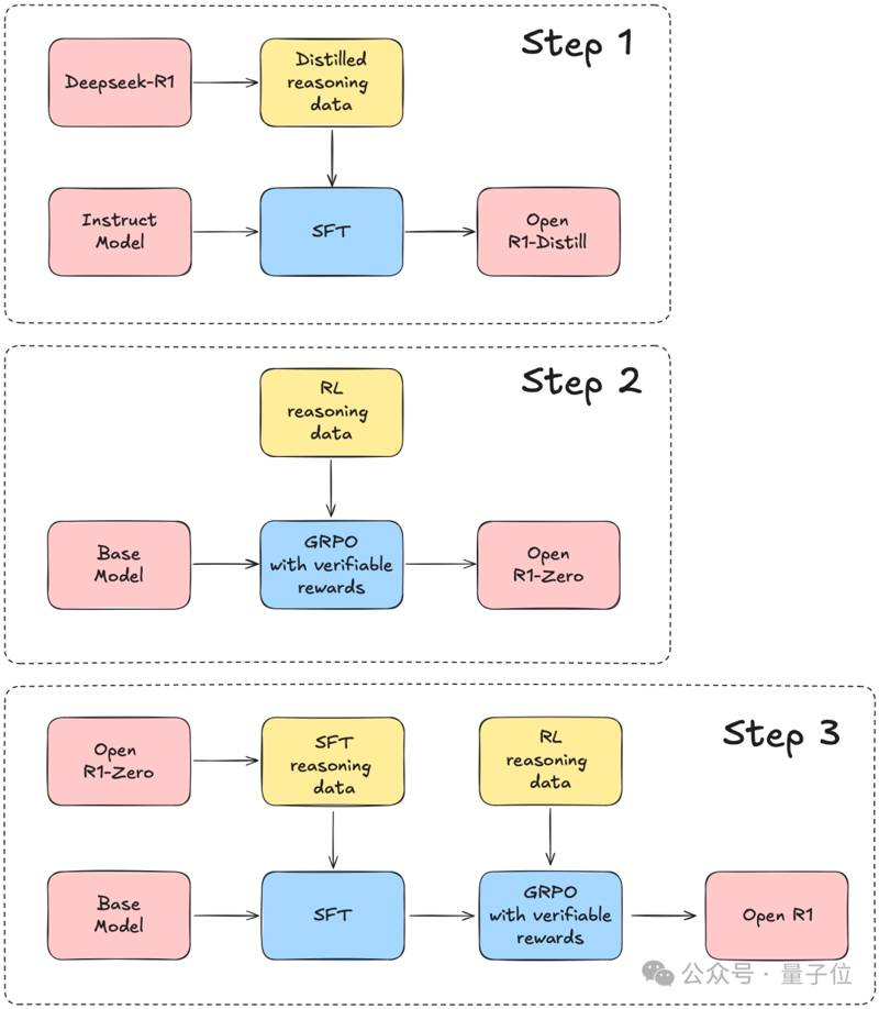 HuggingFace 表示,将以 DeepSeek-R1 的技术报告为指导,分 3 个步骤完成这个项目: