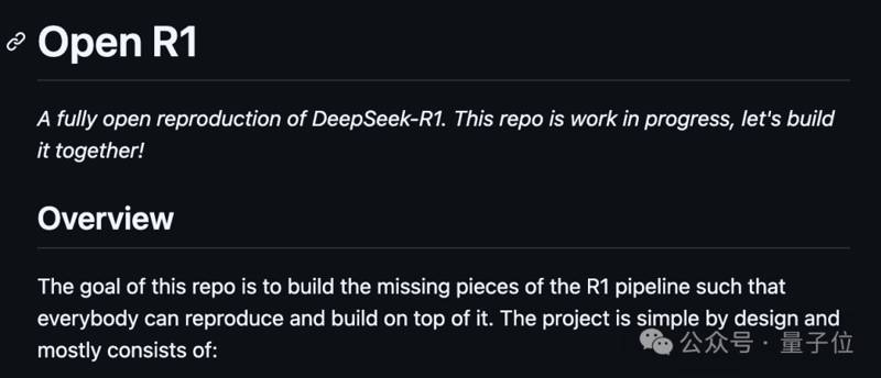 不过话说回来,DeepSeek-R1 本身就是开源的,HuggingFace 搞这么个“Open R1”项目,又是为何?官方在项目页中做了解释:“这个项目的目的是构建 R1 pipeline 中缺失的部分,以便所有人都能在此之上复制和构建 R1。”
