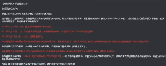 官方透露,停服的原因是腾讯与《黑色沙漠》手游游戏开发商的代理协议即将到期。
