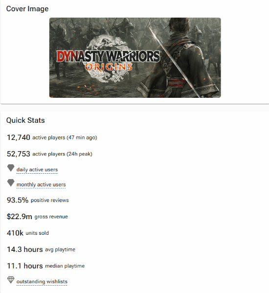 据国外数据分析公司VG Insights的数据显示,截至发稿前,《真三国无双:起源》在Steam平台的预估销量已经达到了41万份,游戏在Steam平台的平均游玩时间为14.3小时,销售额也达到了2290万美元(约合人民币1.659亿)。