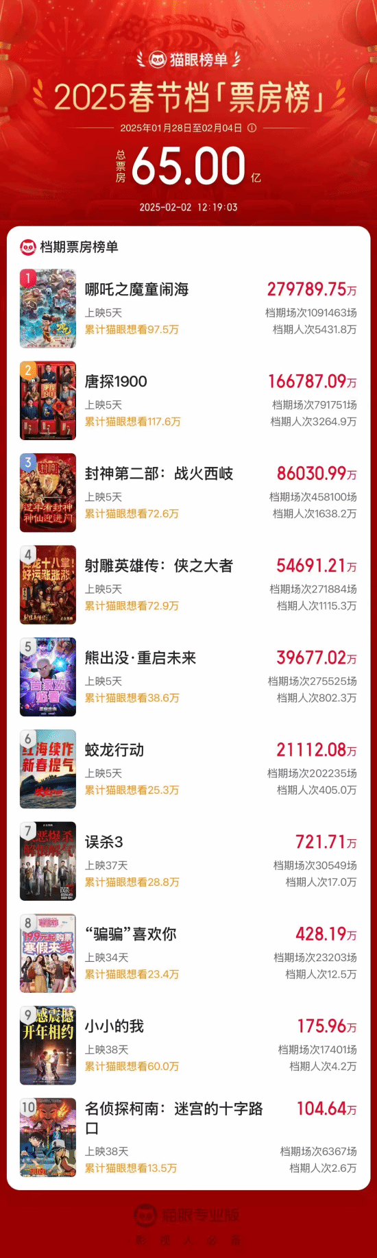 据猫眼专业版数据,2 月 2 日 12 时 19 分,2025 春节档总票房(含预售)破 65 亿元。其中,《哪吒之魔童闹海》独占 27.9 亿元,最终票房预测已超 67 亿元,这意味着它有望创造新的国产片影史票房纪录。