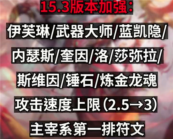 以上便是英雄联盟15.3版本的主要更新内容。玩家们可以在游戏内体验到这些调整,并根据自己喜好选择适合的英雄。