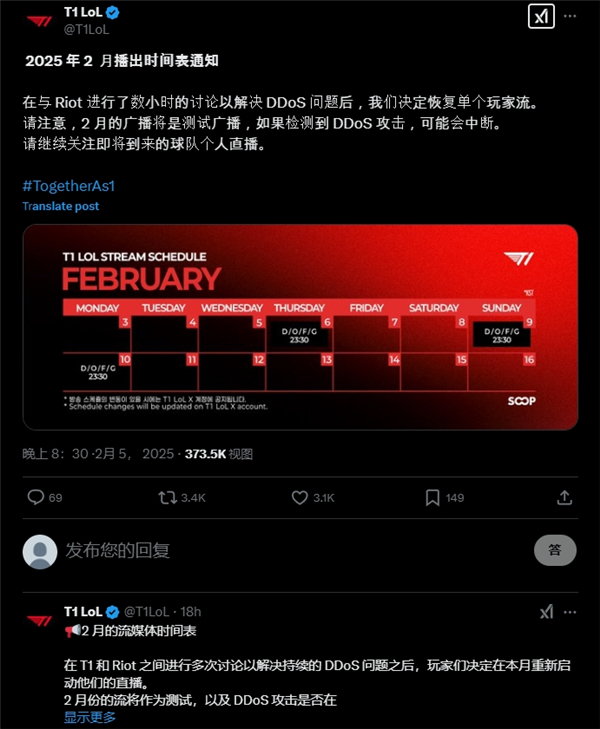 以上便是T1电子竞技俱乐部关于2月选手直播计划的公告,面对DDoS攻击的挑战,他们的决心和行动展示了对粉丝们的无限热爱与责任。希望这篇文章能帮助大家准时锁定直播时间,不错过任何一场精彩的电竞对决!