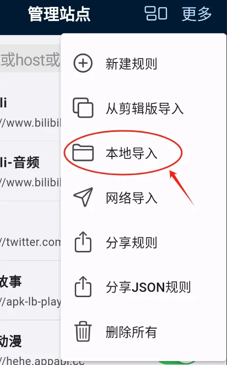 打开益达,右上角的更多,点击本地导入,导入小编准备好的本地规则文件