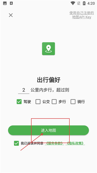 1、打开软件后,首先设置【出行偏好】,在勾选同意协议后,点击【进入地图】,就能进入主界面。