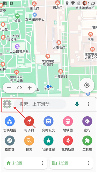 2、于地图主界面,点击搜索栏左侧的头像区域,即可启动登录流程。登录完成后,便能使用诸如收藏、轨迹记录等个性化功能。
