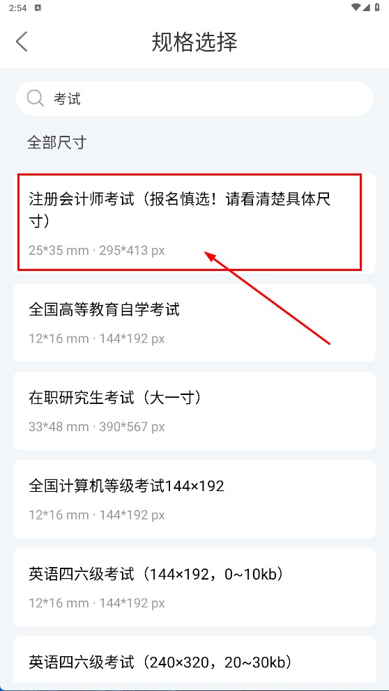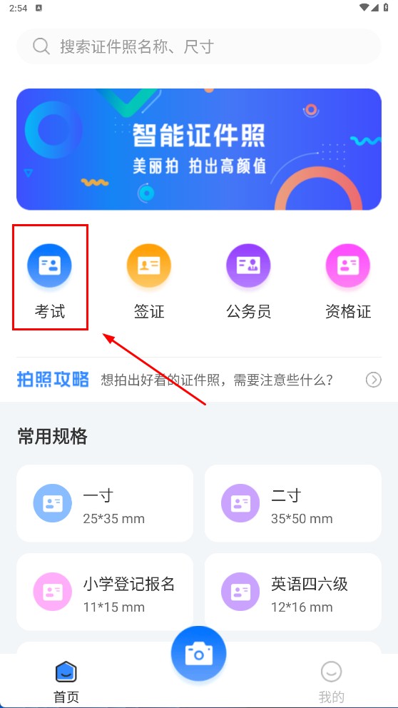 1、在首页点击【考试】分类,进入考试类证件照规格选择界面。
