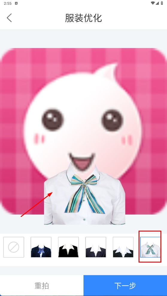 4、进入服装优化界面后,从众多服装样式中挑选出合适的,随后点击【下一步】,以继续推进证件照的制作流程。