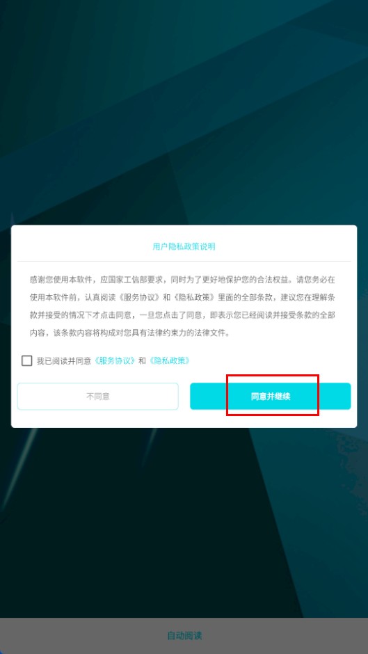 1、先勾选【我已阅读并同意《服务协议》和《隐私政策》】,接着点击【同意并继续 - 按钮】。