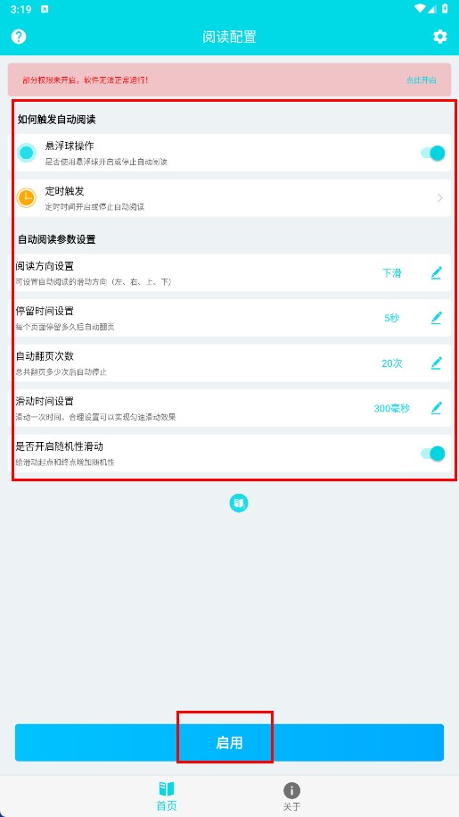 2、在【阅读配置-页面】设置相关参数后,点击【启用-按钮】开启自动阅读功能。