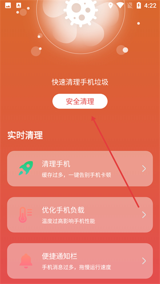 2、在垃圾清理功能页面点击【安全清理】按钮,进入垃圾清理详情页面。