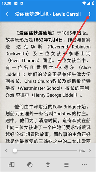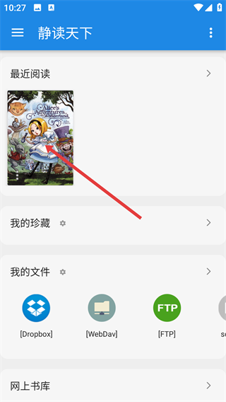 1、在【静读天下】首页点击【最近阅读】中的《爱丽丝梦游仙境》书籍封面,进入书籍阅读页面。