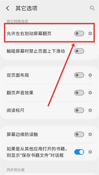 4、在【其它选项】页面中,找到【允许左右划动屏幕翻页】的开关,你能够依据自身需求,选择开启或关闭此功能。