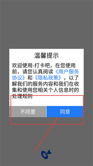 1在温馨提示页面,点击【同意】按钮,即可进入打卡吧的登录界面。