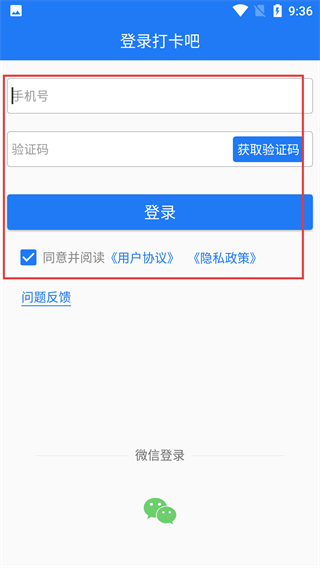2、登录打卡吧界面时,可通过以下两种方式完成登录操作:一是输入手机号,获取验证码后填写,接着点击【登录】;二是选择微信登录。