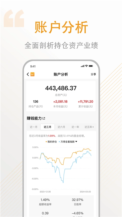 万得基金从海量指标中精心筛选,通过简洁直观的图形界面呈现数据,结合丰富的策略标签与精选数据指标,为用户提供更可靠的理财投资支持。无论专业投资者还是理财新手,都能在这款软件中享受到便捷高效的理财服务。
